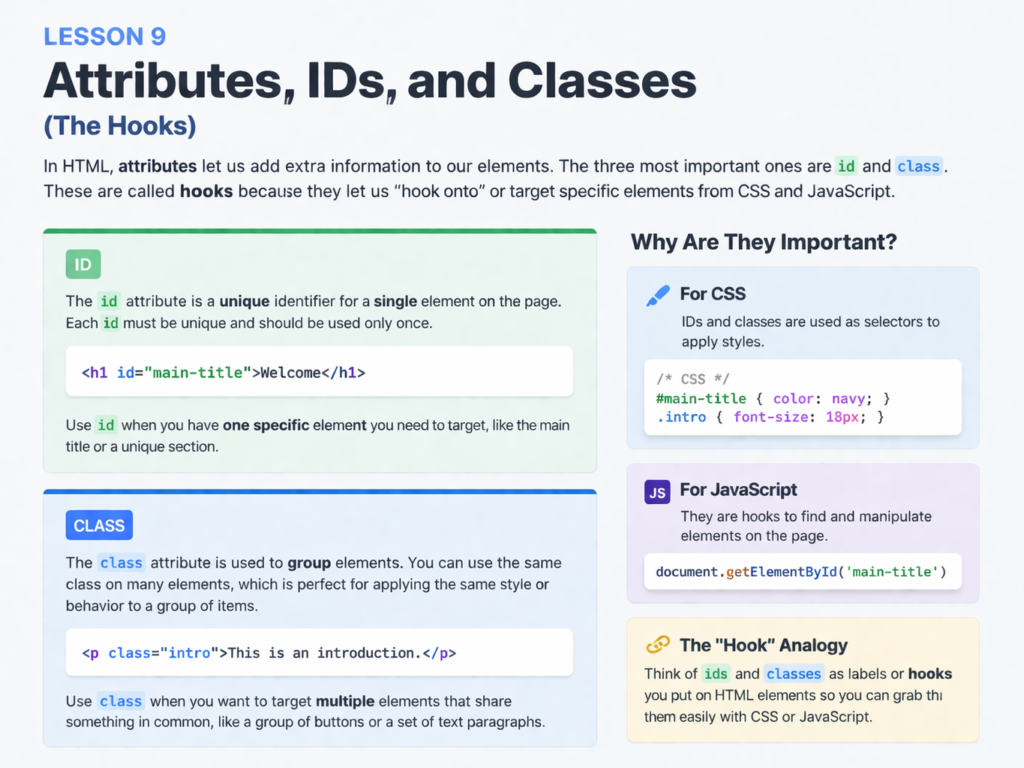 Lesson 9: Attributes, IDs, and Classes (The Hooks)